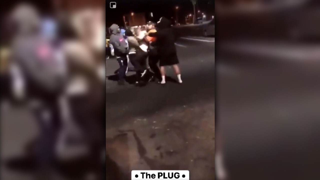 Footage does show that one man does throw a punch while the alleged robber being held, but no further action takes place.