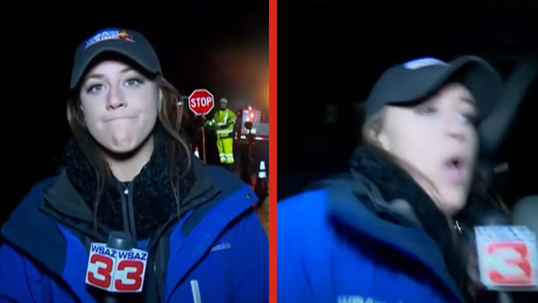 Tori Yorgey, a reporter for WSAZ in West Virginia, America, was in the middle of her live broadcast about a burst water pipe, when a driver turned the corner and hit into her, knocking her over.