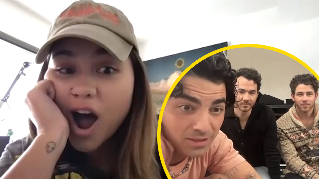 Kevin, Nick, and Joe appear on her screen, immediately praising the Kiwi singer: "We've seen many of your videos. You're so talented."