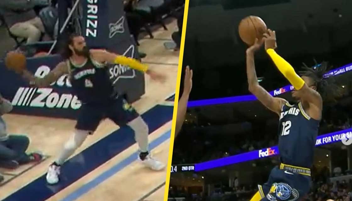 Morant - with just 0.4 seconds remaining in the half to catch and shoot - gets the shot off to beat the buzzer and give Steve one of the best assists you'll see.