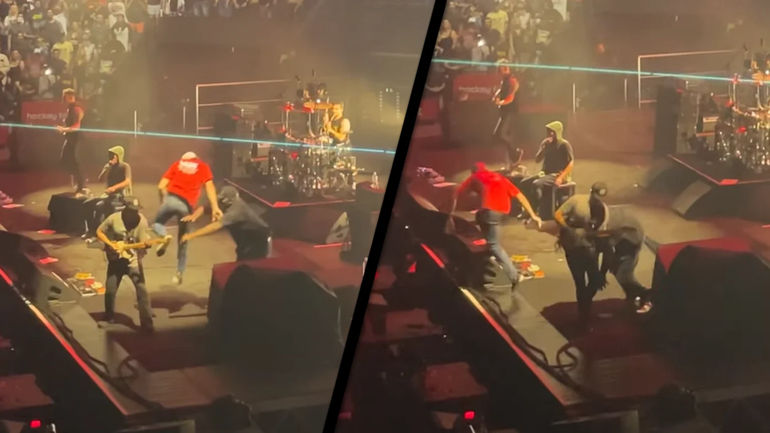 Fan-captured-footage shows a security guard swiftly ran towards the fan as soon as he got on stage. Unforunately, Morello got caught in the crossfire and was tackled off stage by the guard.