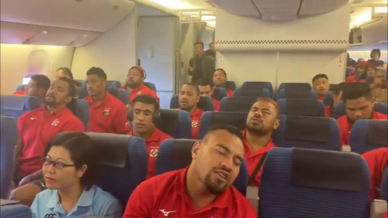 The Tongan Rugby World Cup squad have provided their own brand of in-flight entertainment while touching down in Japan.