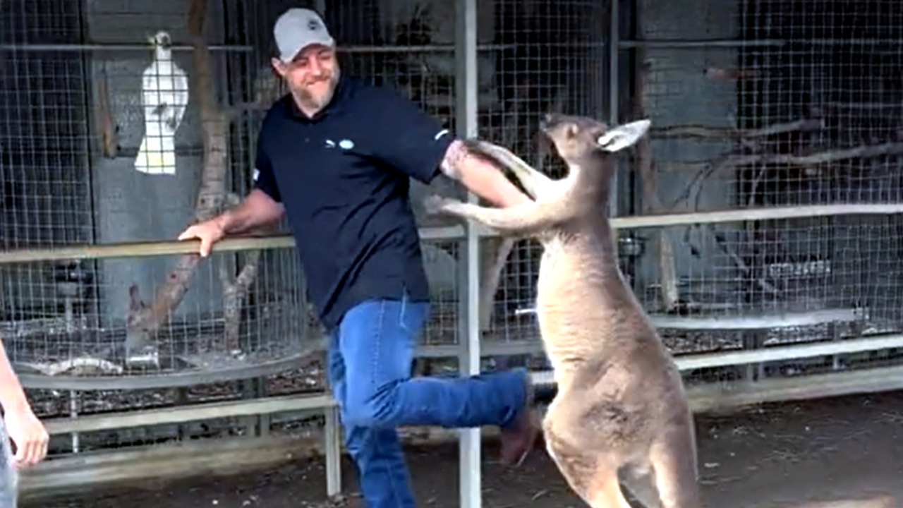 But even with two against one, the kangaroo doesn't back down. It's the sort of stuff you'd usually expect to see at the local after a few too many lemonades, not at a wildlife park.