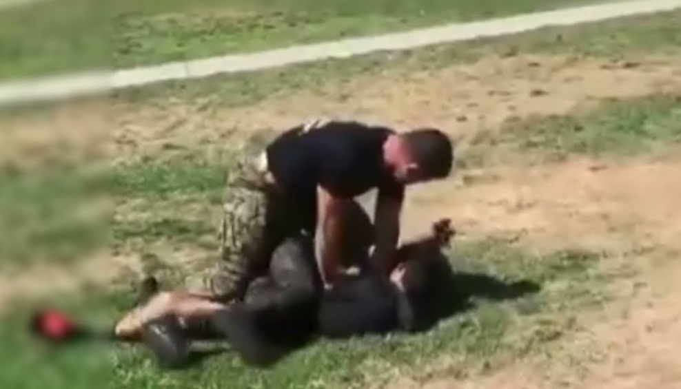 A video shared on social media shows the two students trading blows outside the school when the marine, Valdez Sarmiento, blindsides the pair with one of the most brutal double tackles you've ever seen. See the video and massive hit below.