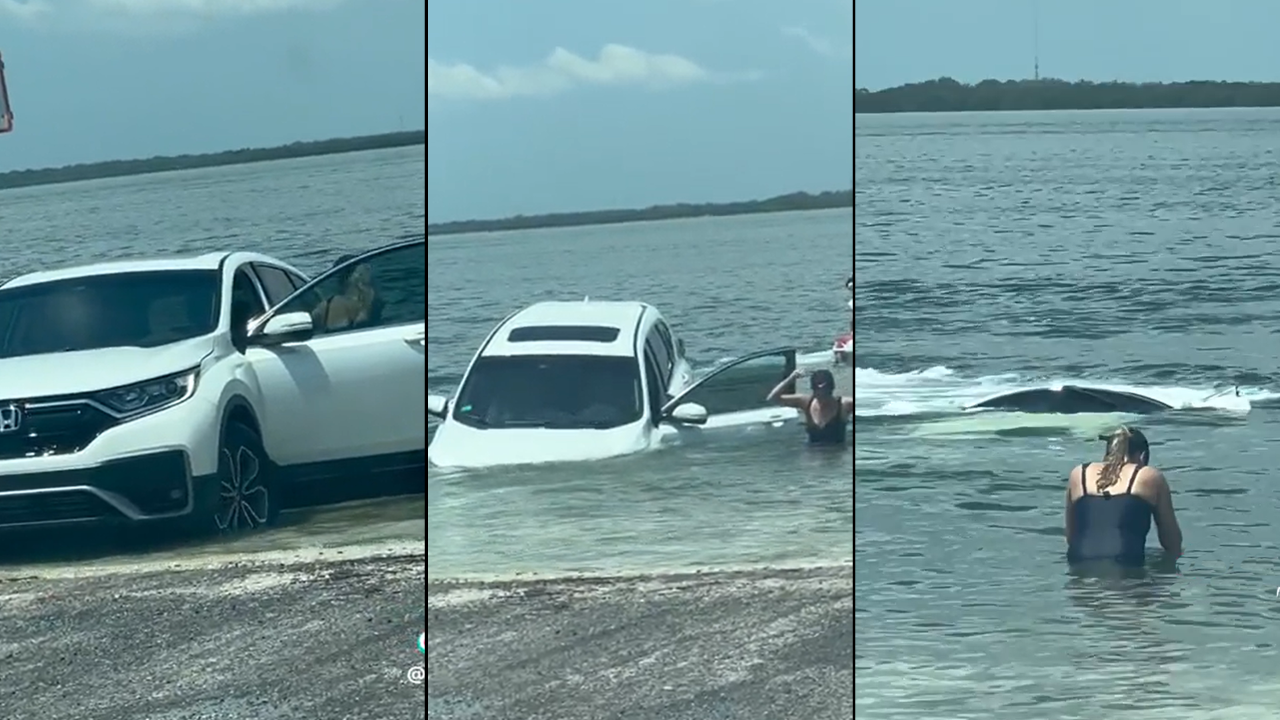 The video shows a white Honda CR-V backed down a boat ramp, before a woman hops out to help pop a jetski on the trailer. At the very start of the video, the car is already way too deep in the water, and when the woman hopes out of the car, things go from bad to worse.