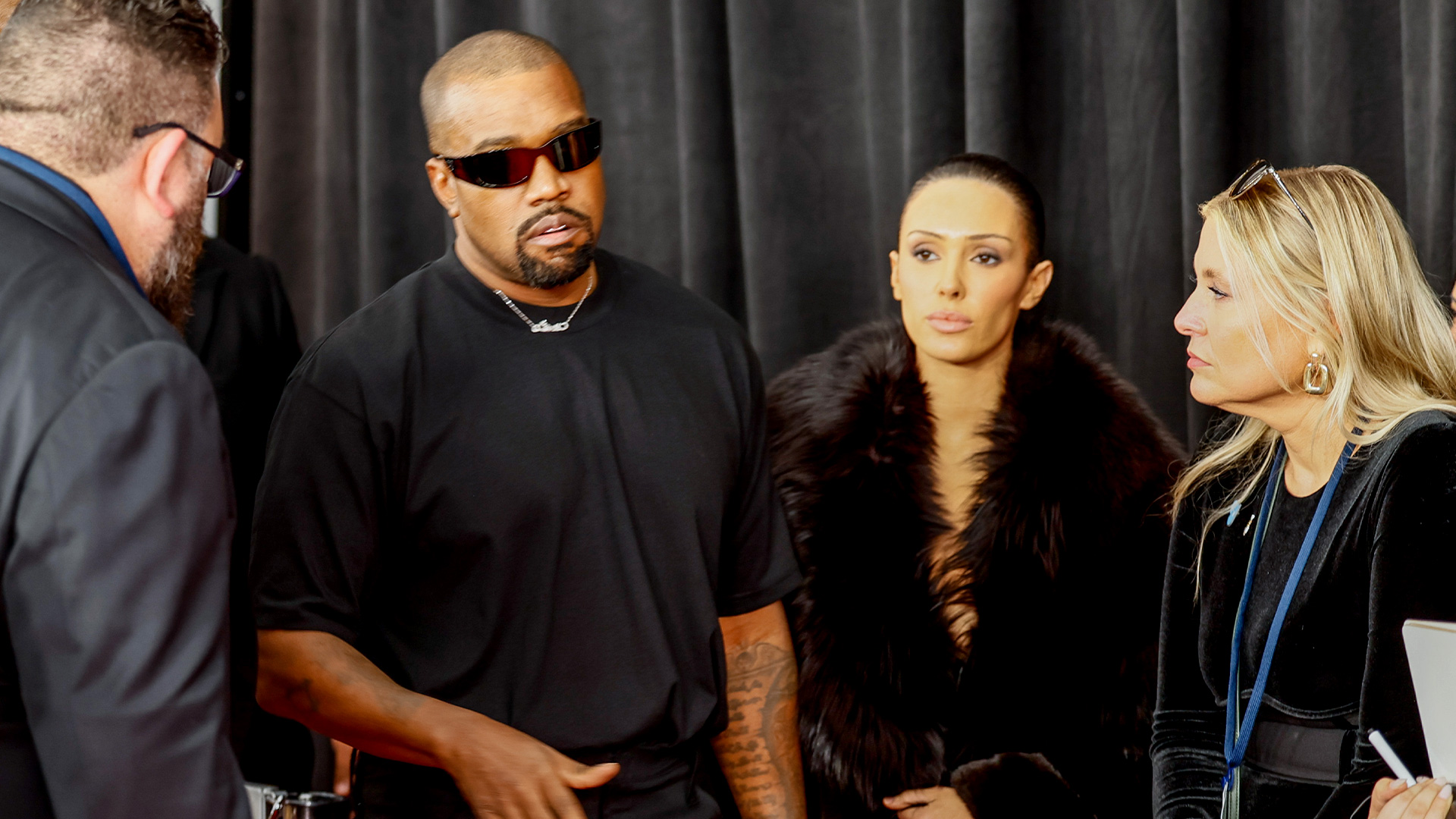 The 'Stronger' rapper and the Australian architect stunned onlookers on the red carpet at the Grammy Awards in Los Angeles when she dropped her floor-length fur coat in front of photographers to reveal a completely transparent minidress without undergarments.
