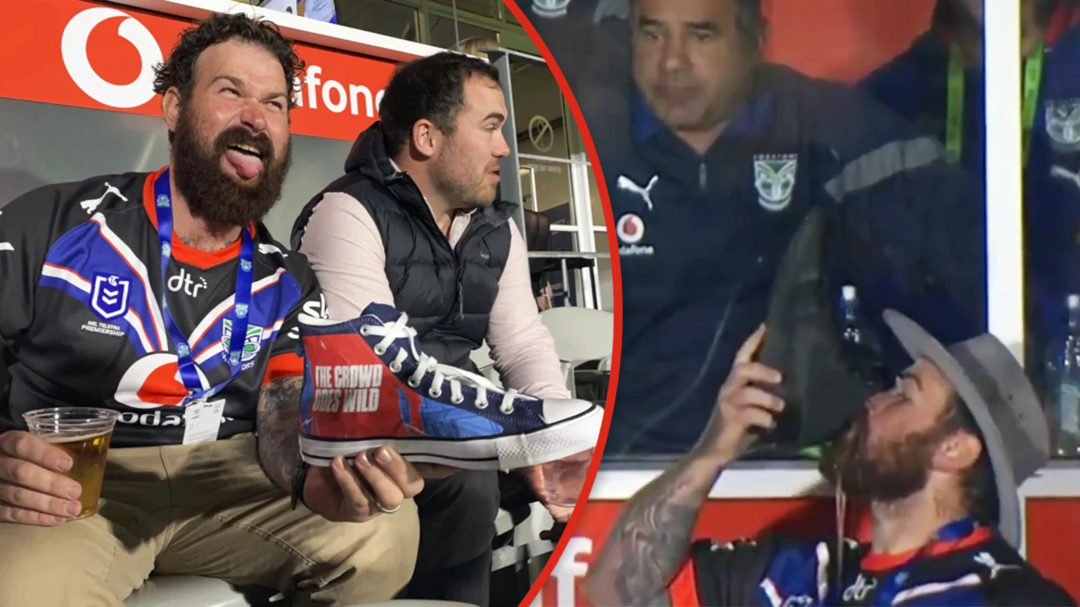 Calley parks up at his seat in front of Warriors coach Stacey Jones' box at Mt Smart Stadium, and whenever the camera goes to Stacey to see his reaction, Calley gets back and smashes back a shoey.