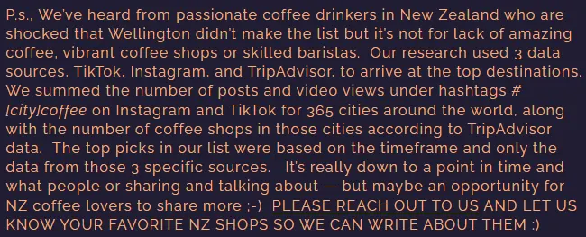 They explain Welly's been left off the list "not for lack of amazing coffee, vibrant coffee shops or skilled baristas", but because Kiwis are not sharing their fav spots on social media enough. At the end of the message though, they hint that an NZ coffee ranking might be on the way!