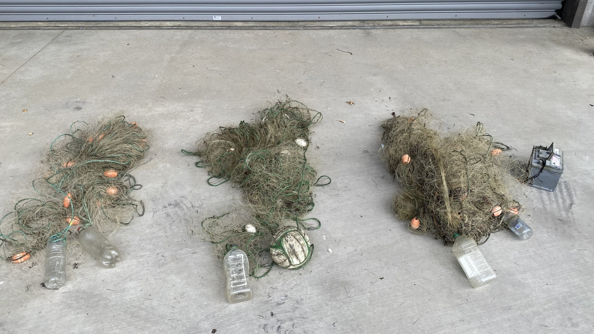 Image: Three recently recovered illegal set nets, with a volleyball as a buoy and a car battery as a weight (provided)