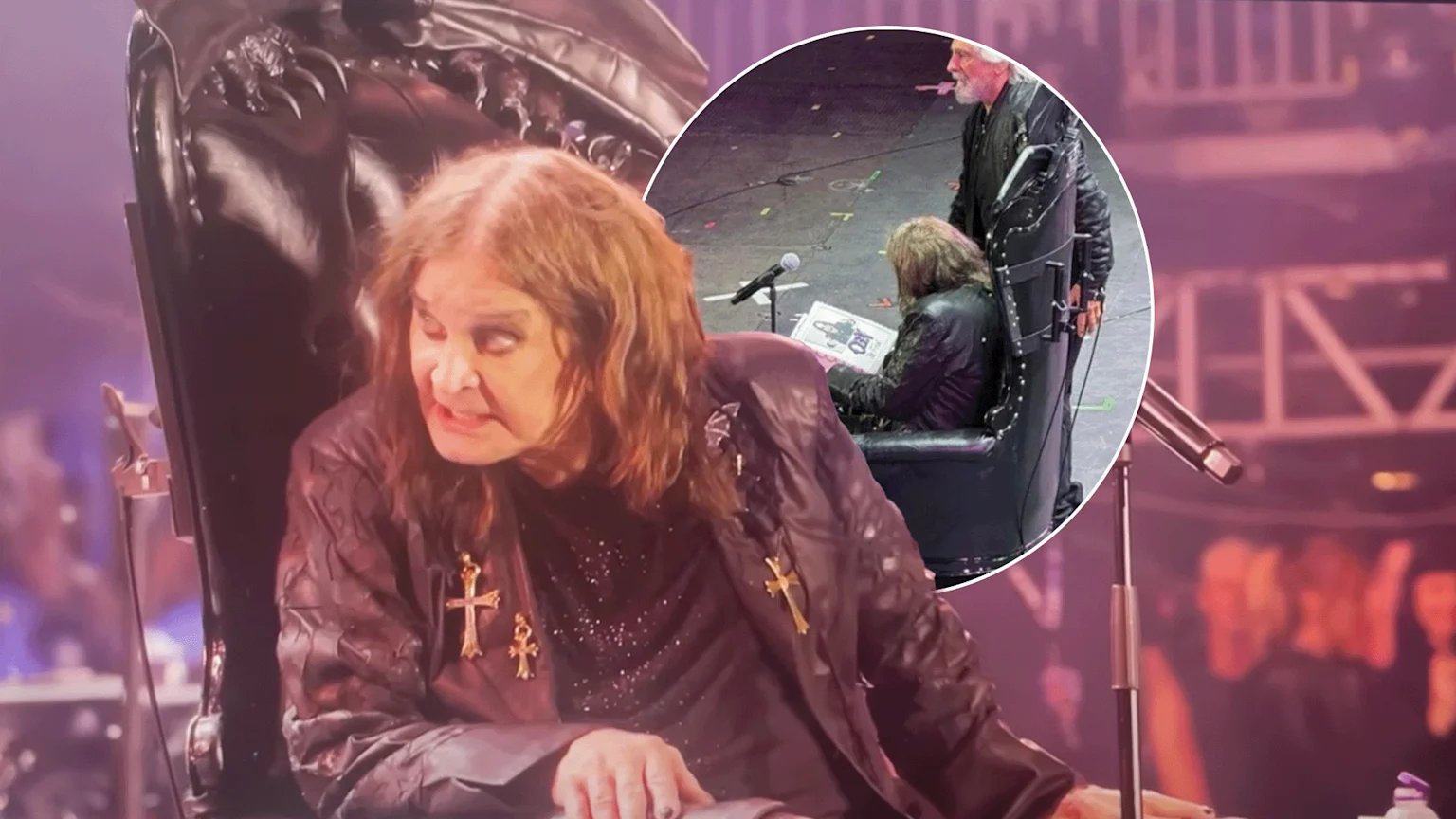 What the global stream failed to clearly capture was Butler then returning to the stage and giving Ozzy a cake while he sat on his throne, decorated with the Prince of Darkness likeness on it. (While we watched the live stream, we did wonder if we saw a glimpse of a cake on Ozzy’s lap, but it wasn’t super clear.)