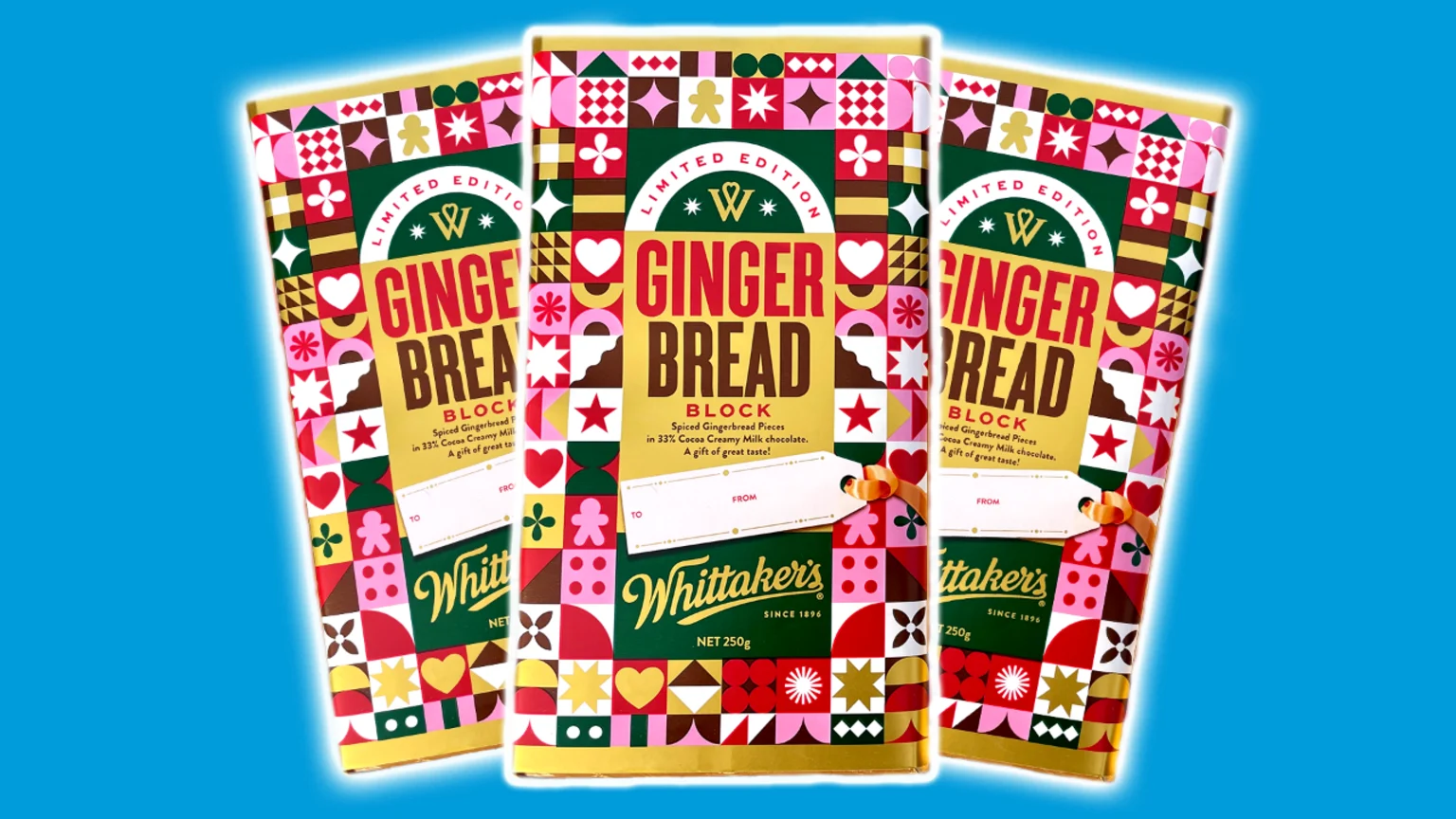 Gingerbread blocks will be available in blocks and made from Whittaker's classic cocoa Creamy Milk chocolate and a mix of spiced gingerbread pieces mixed throughout. To add a little extra festive flavour to the blocks crystallised ginger and golden syrup have been added to sweeten up even the grumpiest grinches this holiday season.