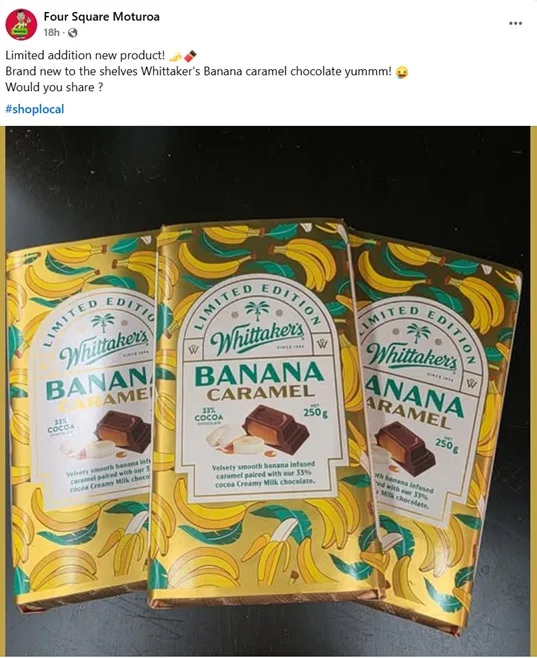 Meanwhile, Four Square in Moturoa seems to have already had its delivery, also sharing a snap of the packaging, writing: “Brand new to the shelves Whittaker’s Banana caramel chocolate yummm!”