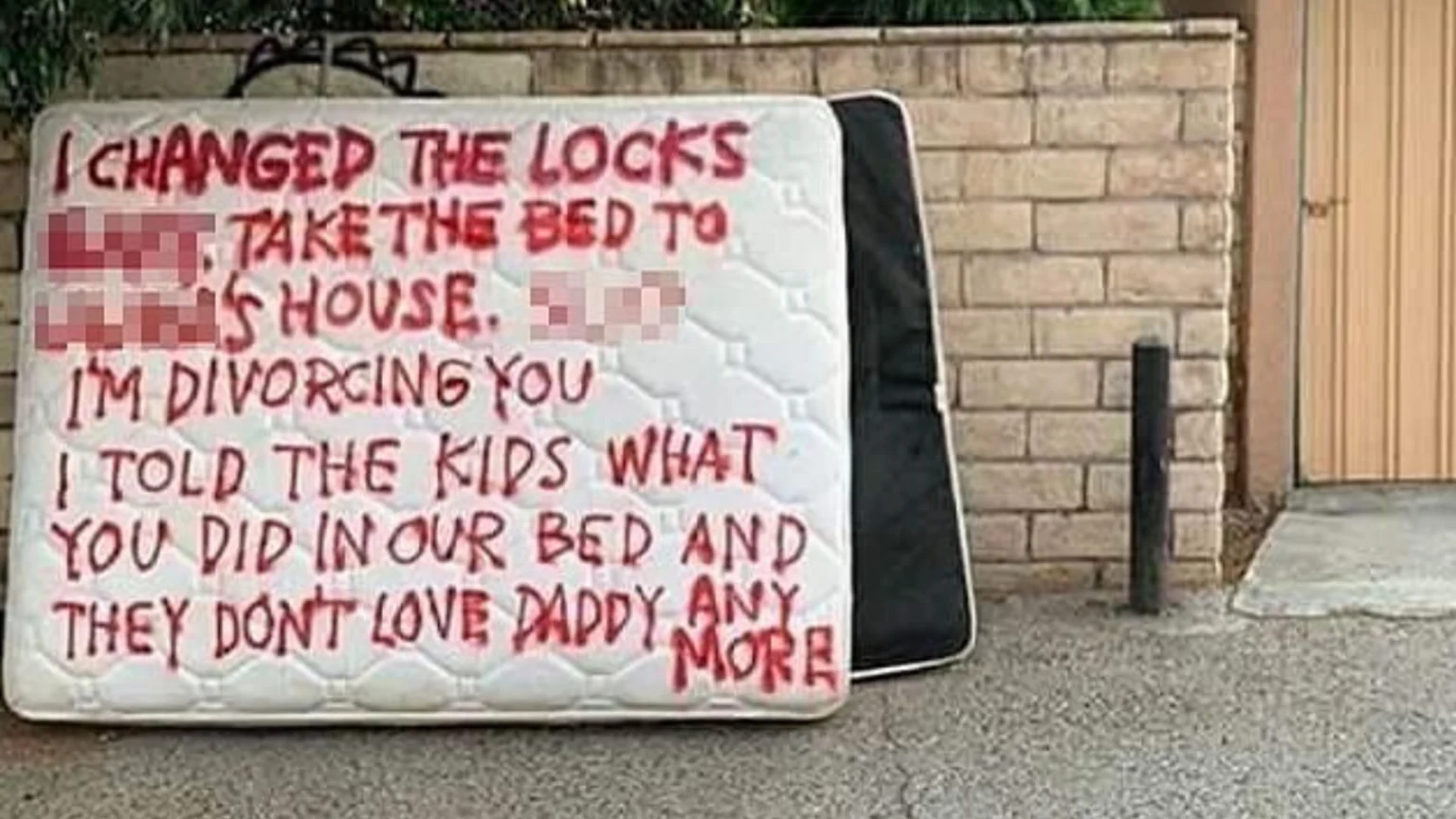 Wife shames cheating husband by spray painting brutal message on their mattress outside their house
