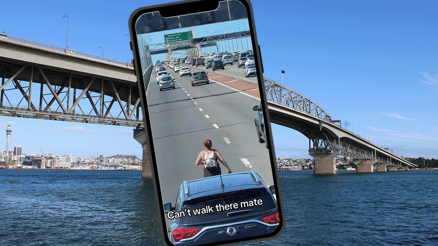 Woman goes viral for casually walking on Auckland Harbour Bridge amidst traffic