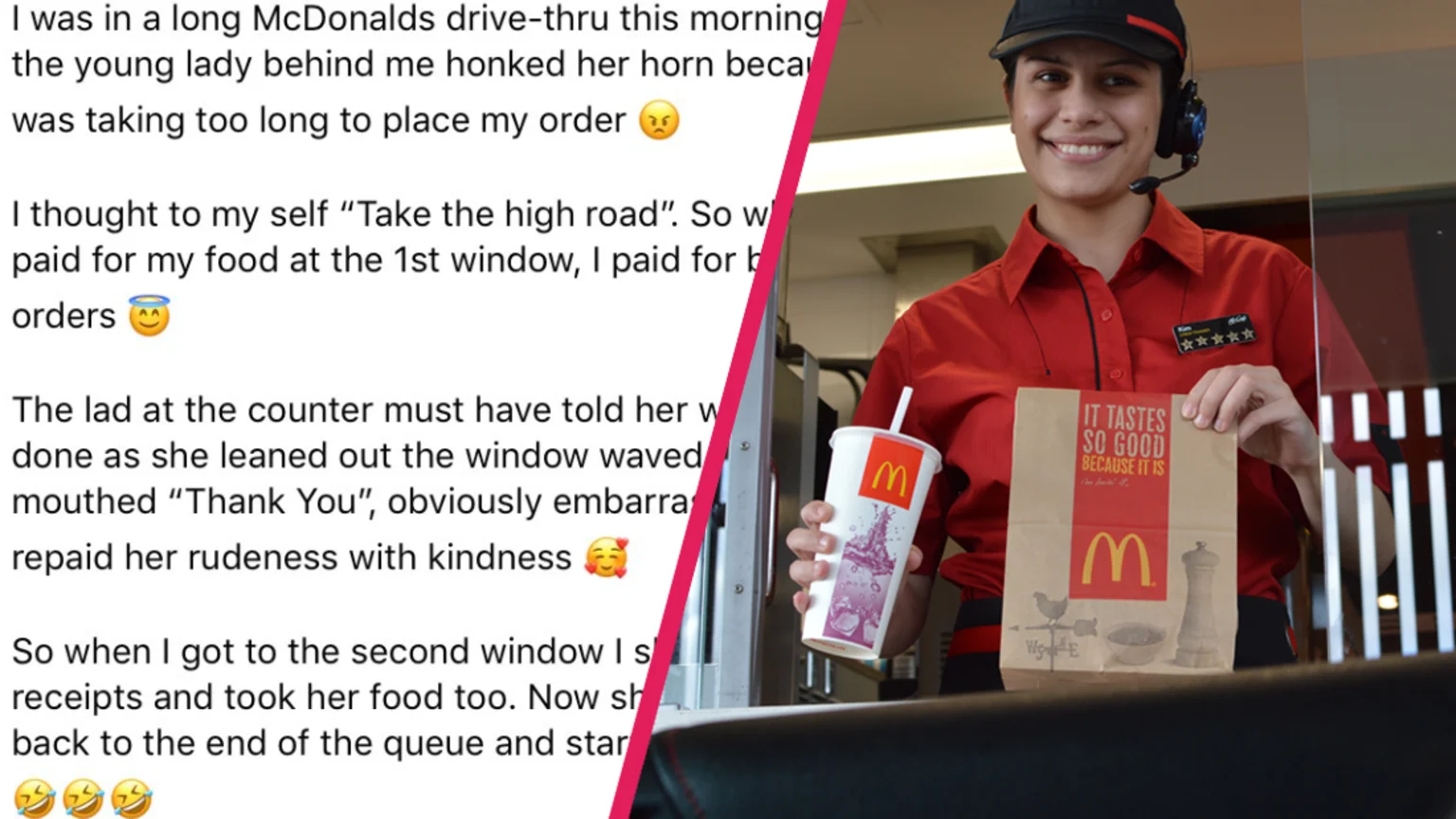 "I was in a long McDonald's drive-thru this morning and the young lady behind me honked her horn because I was taking too long to place my order," she posted in the Canberra Notice Board Facebook group.
