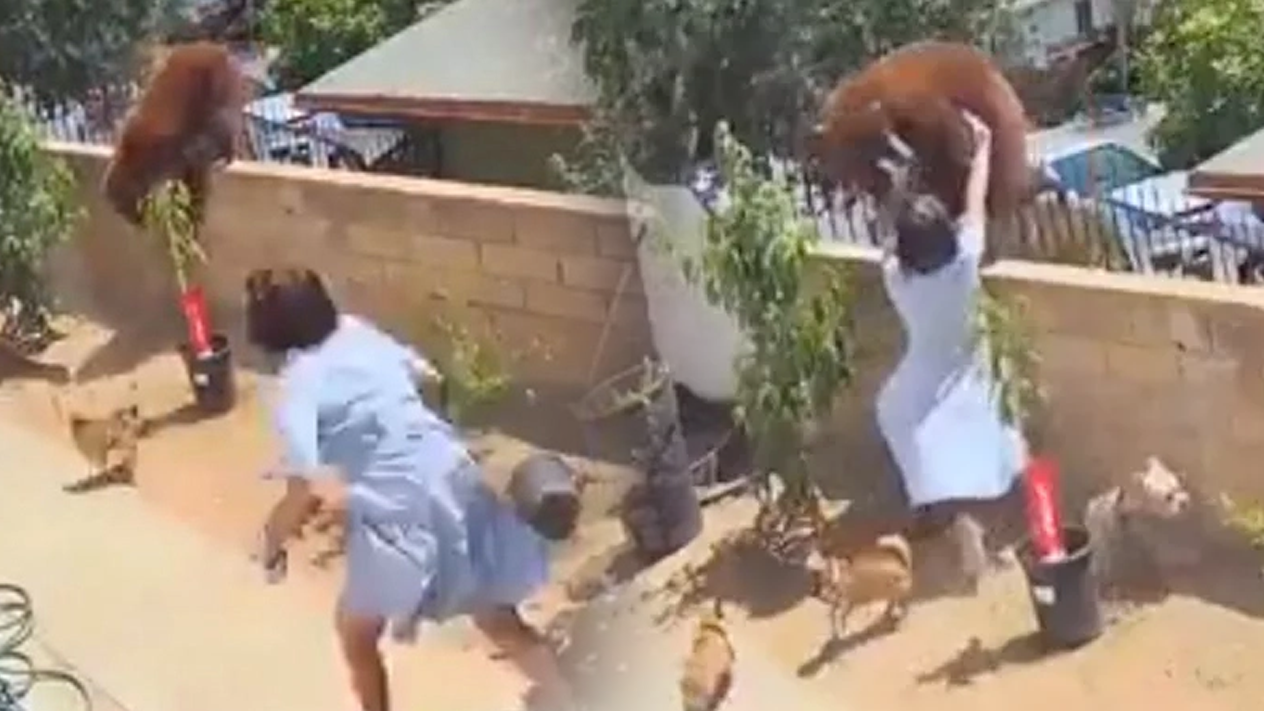 A woman has gone viral after a video of her shoving a brown bear off a fence to save her dogs was posted on TikTok.