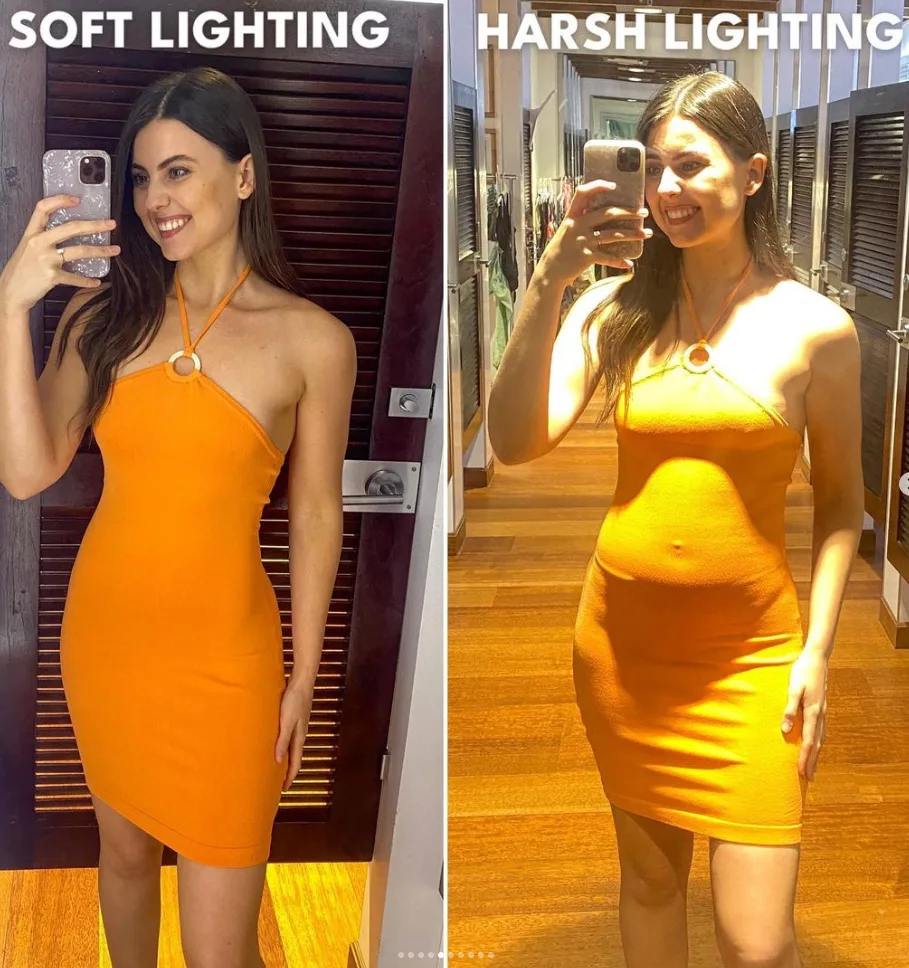 In one picture, the soft lighting made her look flattering while the other showed the harsh lights glaring down on her from the ceiling cast a shadow on every "lump and bump".