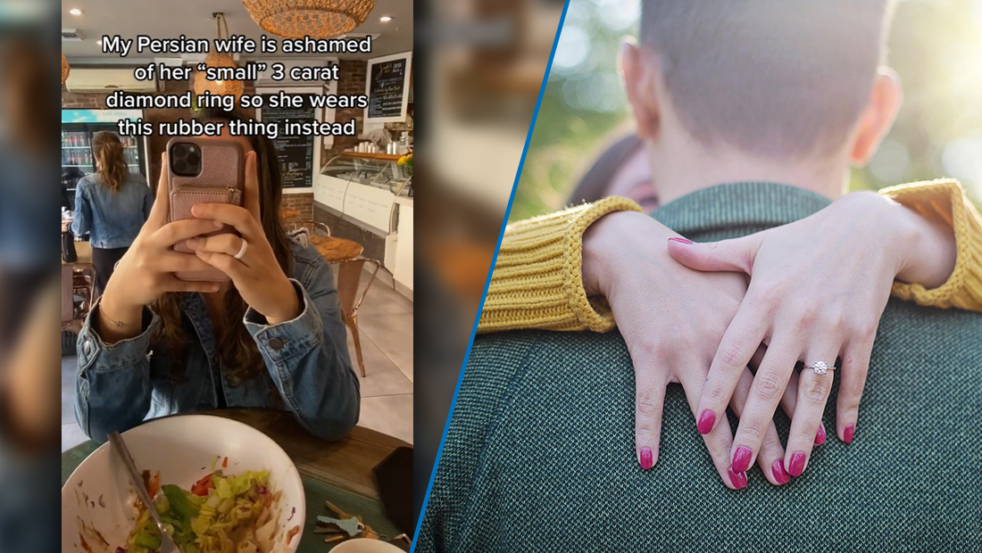 "My Persian wife is ashamed of her 'small' 3-carat diamond ring so she wears this rubber thing instead"
