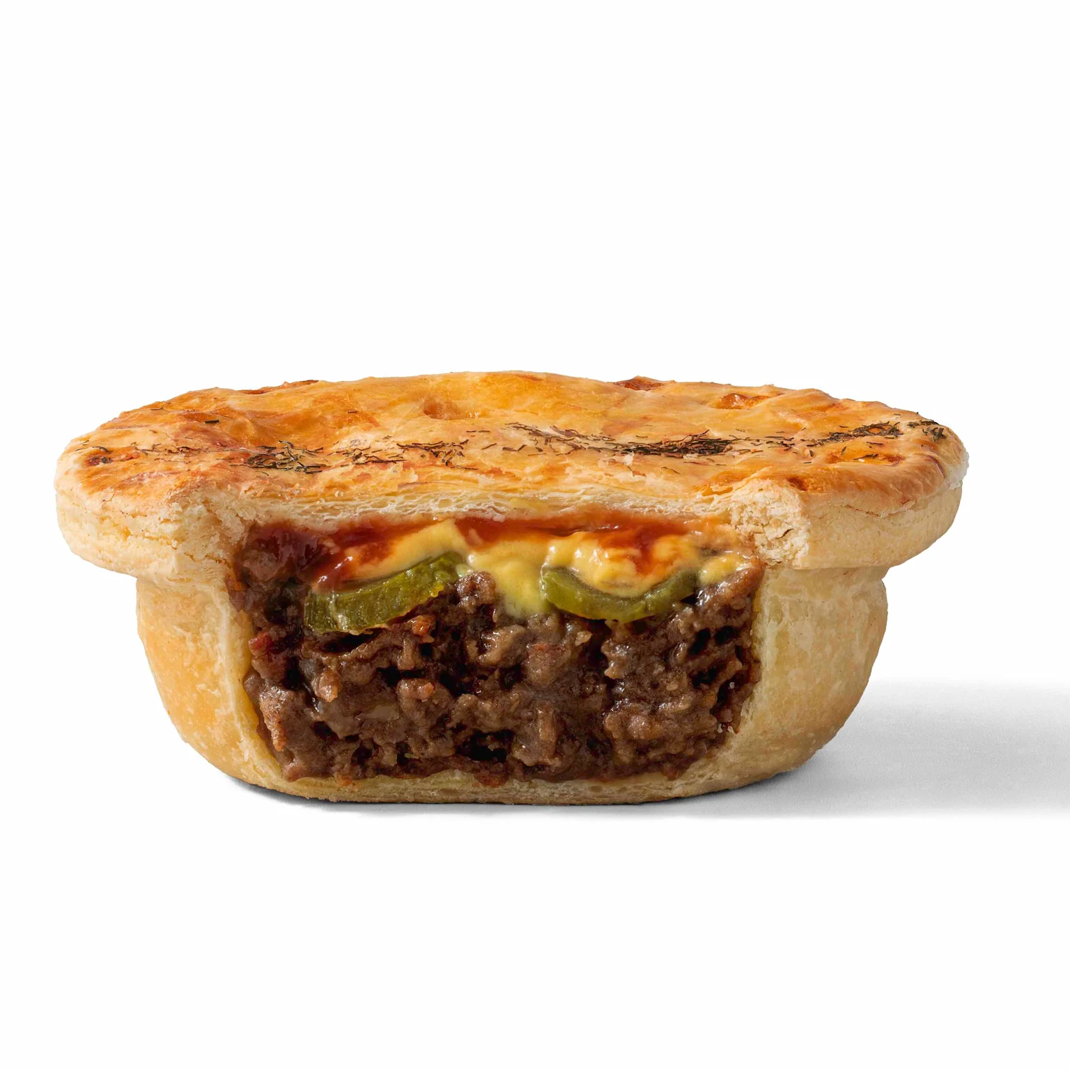 Merging the classic mince pie and the iconic cheeseburger, it includes NZ Gourmet Angus beef mince, a cheesy mustard sauce, pickles, onions, and of course, tomato sauce.