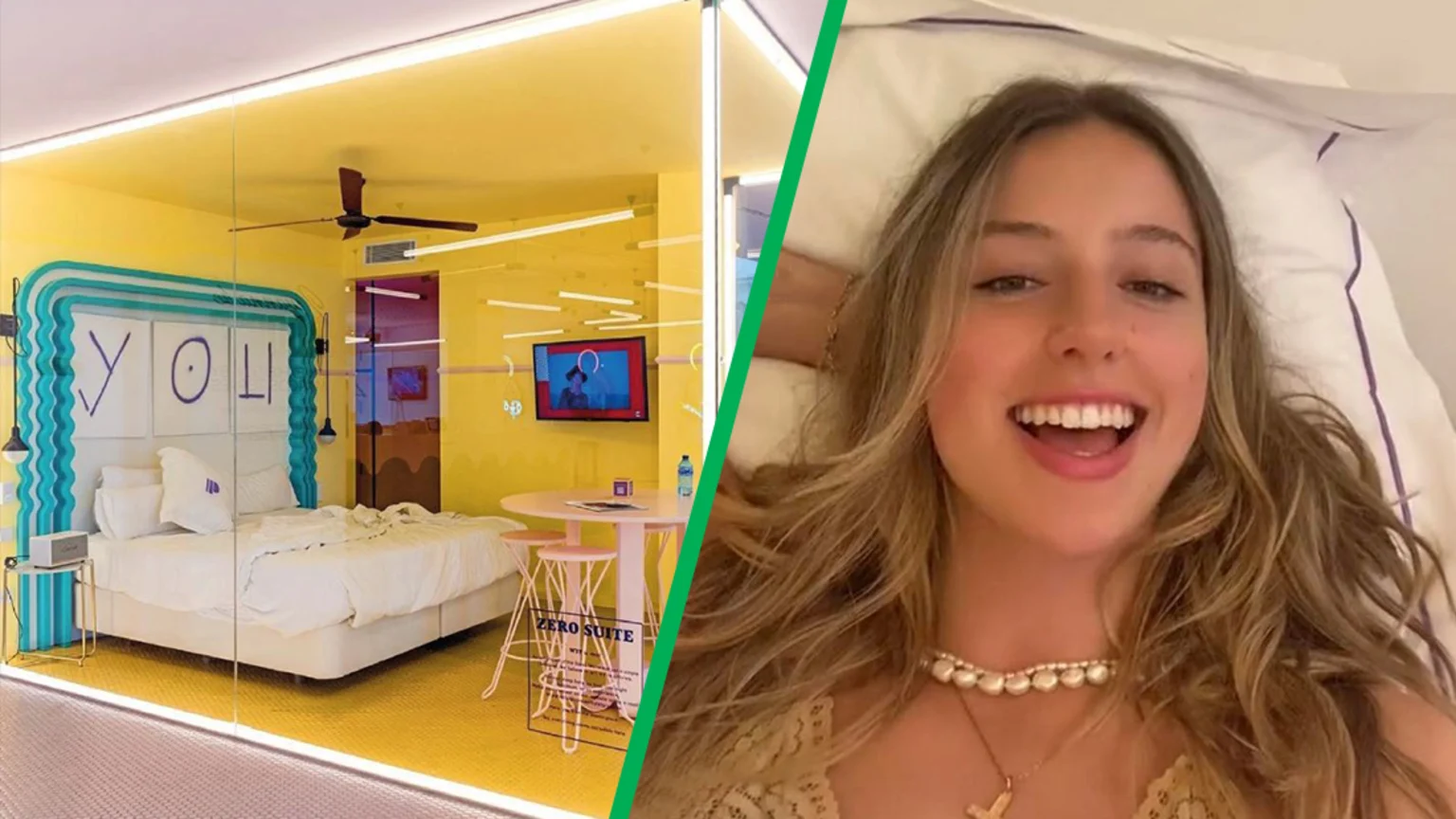 The fact that it's free miiiight tempt us to stay a night in the exhibitionist's dream room. But one look at what it's like on the inside - provided by TikToker Olympia Anley - puts us back firmly in the 'get effed' mindset.