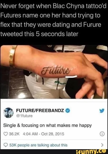 Blac Chyna got a tattoo of Future's name on her hand, meanwhile he tweeted that he was "single and focusing on what makes me happy".