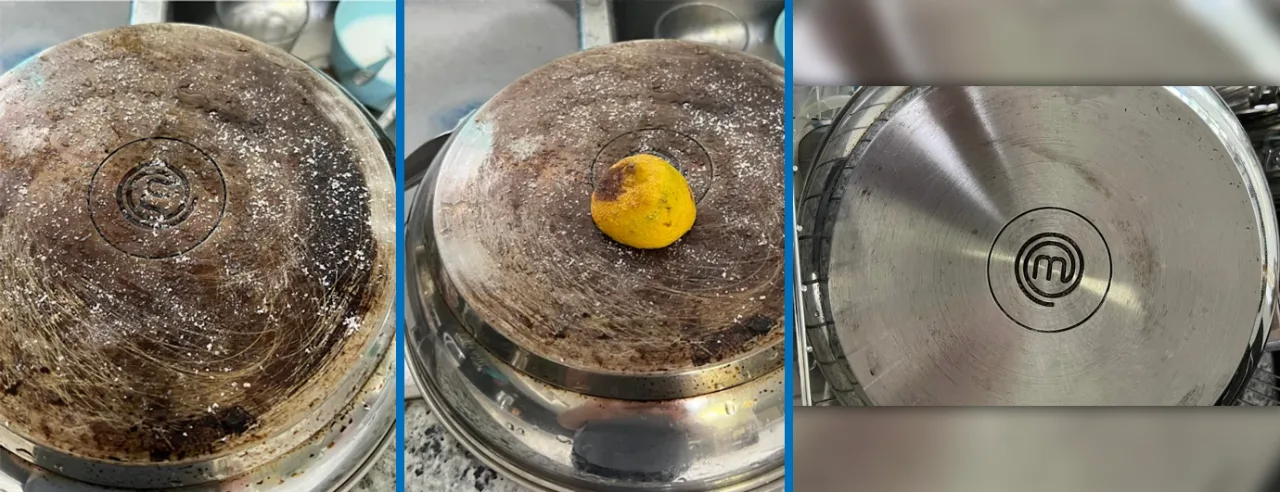 The best part is it only uses two ingredients that you most likely already have in your home! All you need is a lemon and a bit of salt to clean the bottom of any frying pan. "chuck on rock salt, get your lemon, and rub it" easy as that! And the proof is in her pictures, just look at the change.