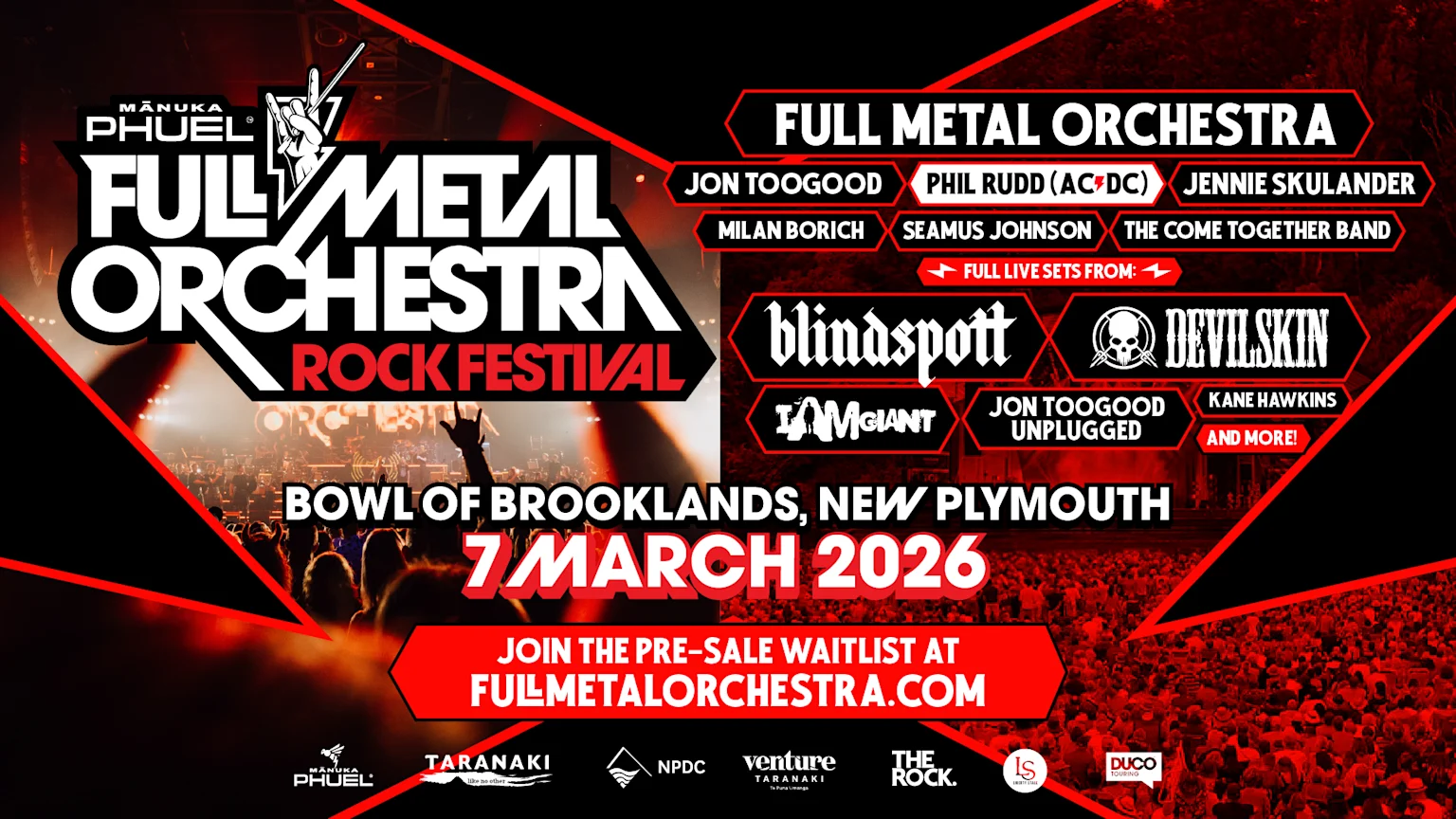 Full Metal Orchestra returns for its first show in 2026 heading to the iconic Bowl of Brooklands, New Plymouth – and it’s a full-blown outdoor rock festival!