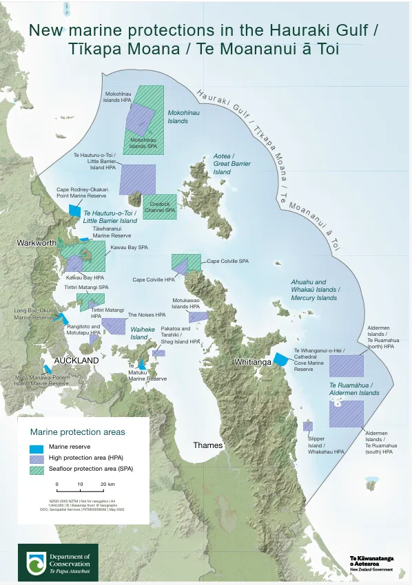 The Department of Conservation is stoked to let you know about the 19 new protected regions of the hauraki gulf, this has been the greatest increase in Aotearoa New Zealand's marine protection in over a decade to keep our waters beautiful for generations to come.