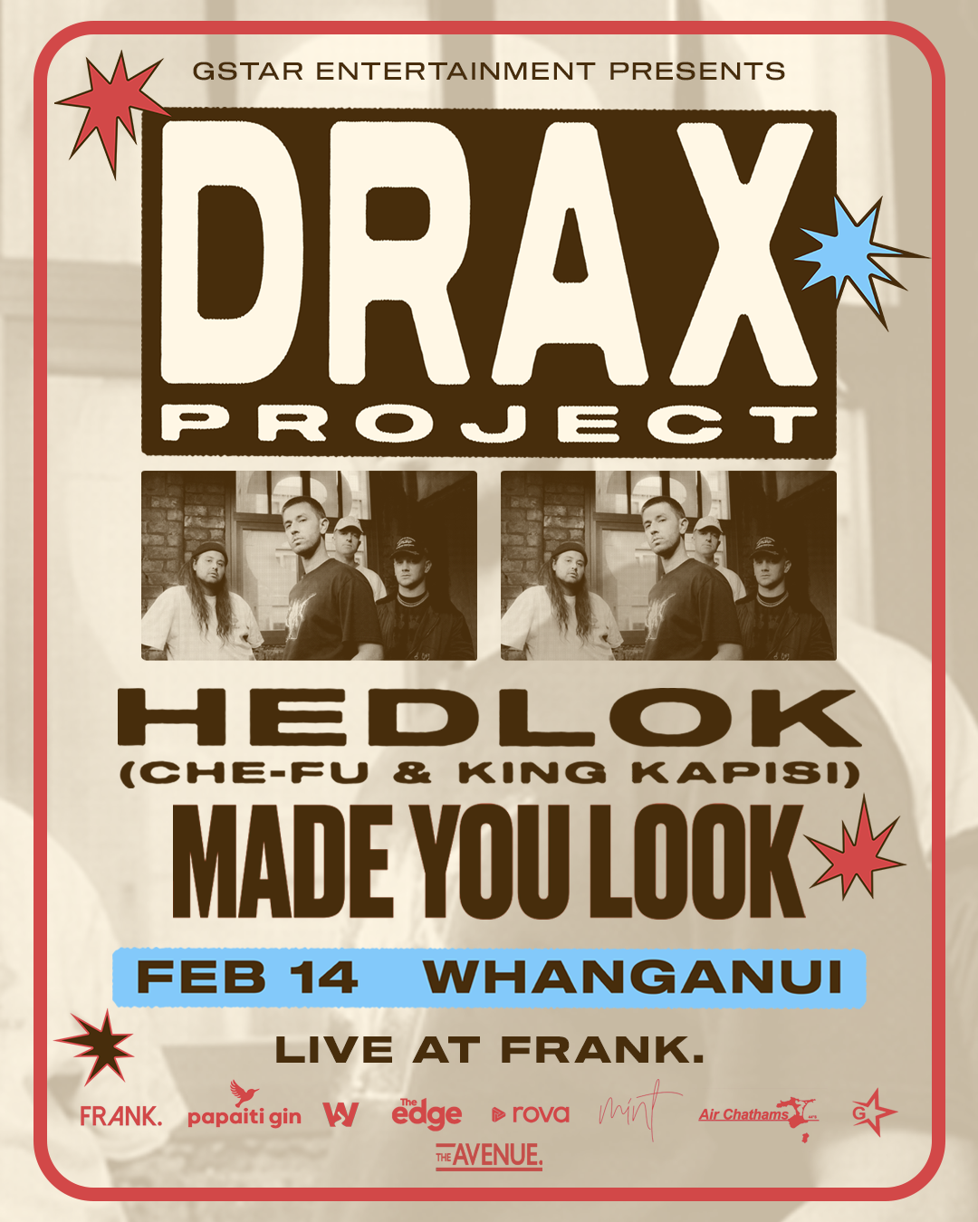 Kiwi pop sensations Drax Project have announced their first ever performance in Whanganui; a special headline show this Valentine's Day featuring NZ music icons Hedlok; Che-Fu & King Kapisi, and Auckland alt-rock duo Made You Look, February 14th 2026 at Frank Bar.